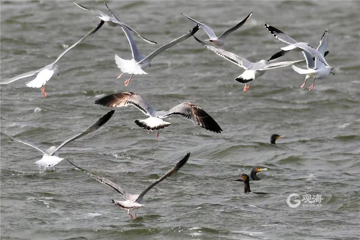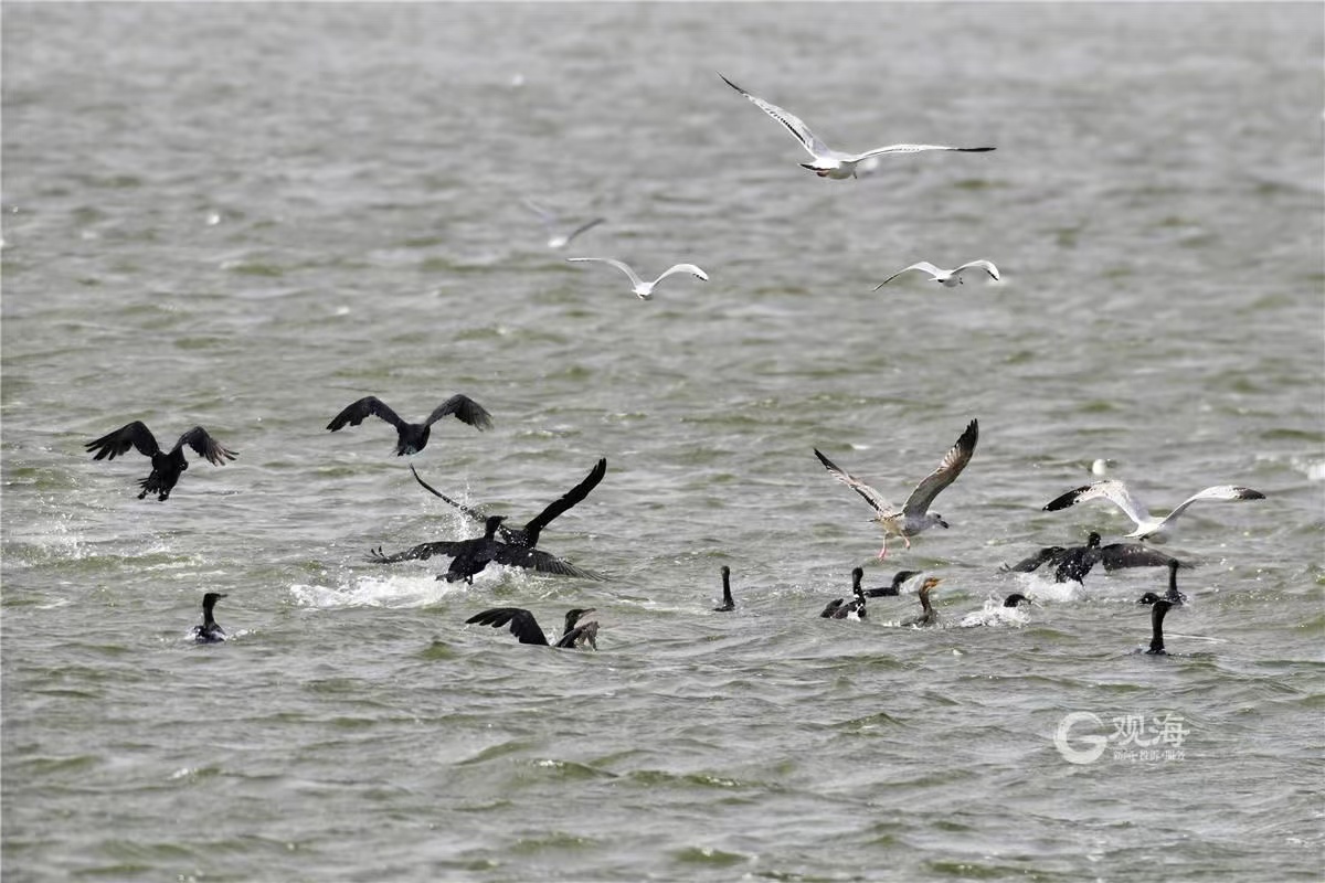 Flocks of cormorants catching fish, attracting black-headed gull to compete.(Photo via Wang Haibin)