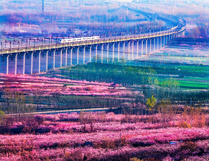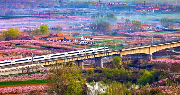 As it runs through scenic spots in the Qingdao West Coast New Area of Shandong province — which is carpeted in the abundant blossoming flowers of spring — the Qingdao-Yancheng railway is boosting its reputation for giving passengers excellent views of spring scenery.
