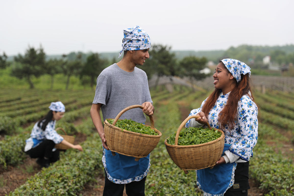 International Students from Peru and Burundi are learning how to pick new tea from tea farmers. Photo by Zhang Jingang