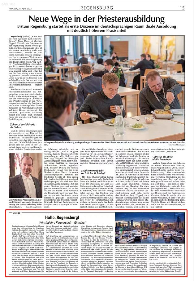 On April 27, Regensburg of Germany, Qingdao’s sister city, published the city report on Qingdao named ‘Hello, Regensburg! I’m your sister city, Qingdao! ’ in Regensburg Daily.