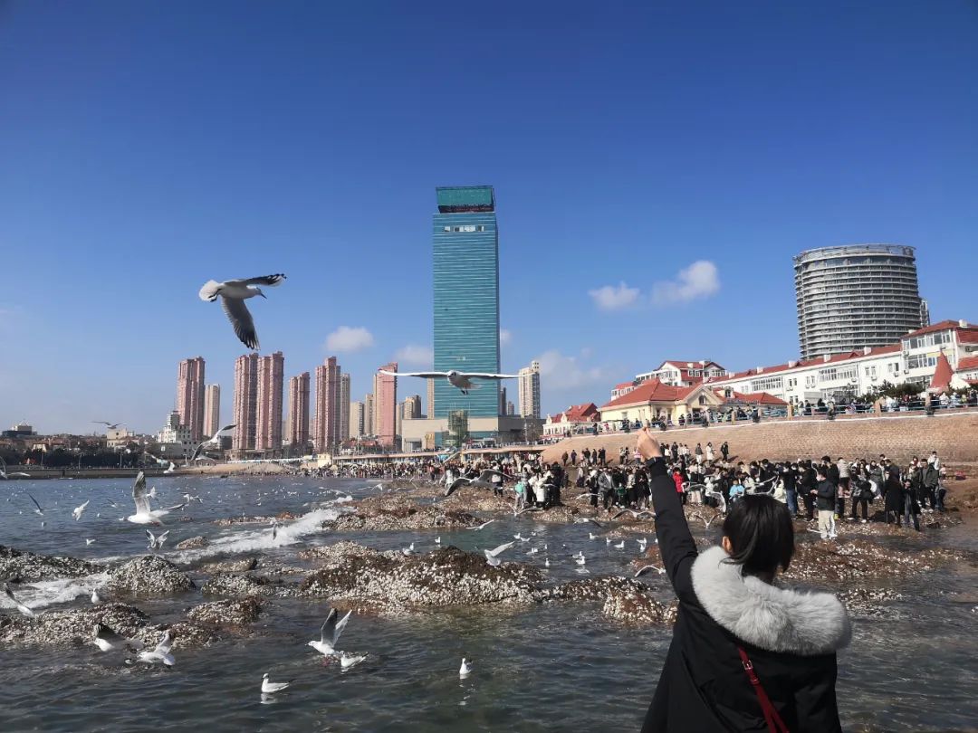 Nowadays, there are a large number of gulls and other wild birds inhabiting the coast of Jiaozhou Bay. Every winter, a large number of people and tourists are attracted by the gulls to come to the seashore to feed and enjoy the gulls. The picture of people and gulls playing together in harmony has become a new city card.