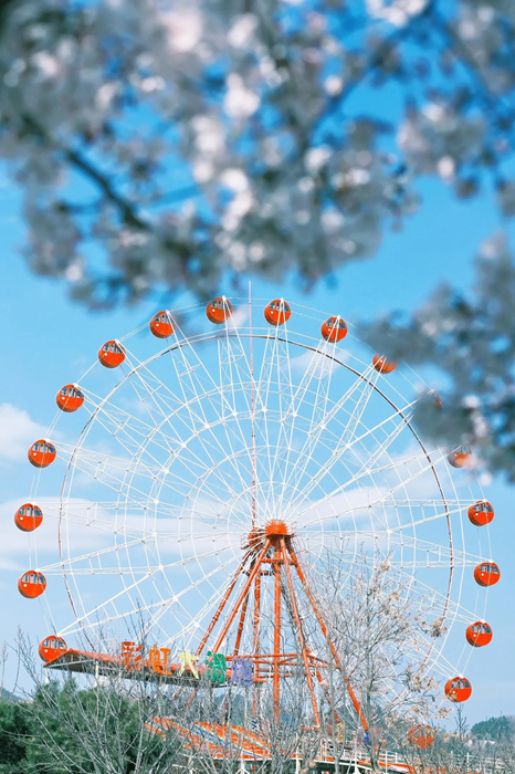 The blue sky, white clouds, and the striking ferris wheel form a striking backdrop to the blooming cherry blossoms at Qingdao International Horticultural Expo Park. [Photo/Dazhong Daily]