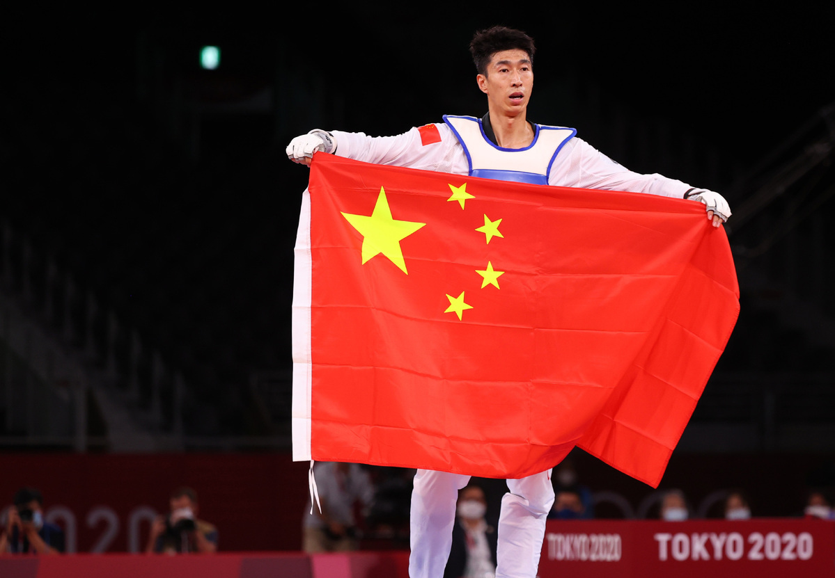 Taekwondo star Zhao Shuai Celebrates With the Chinese Flag After Winning Bronze