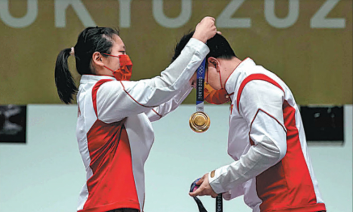 Jiang Ranxin places the gold medal on her teammate Pang Wei