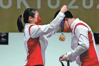 Jiang Ranxin places the gold medal on her teammate Pang Wei