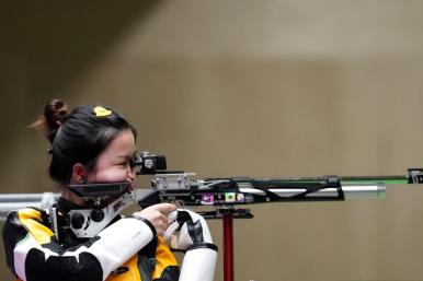 China's Yang Qian Takes Aim During the Women's 10-meter Air Rifle Competition?